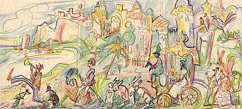 Farbige Handzeichnung von Fritz Hanel zur Geburt der Freundestochter Karin Godzik in einem persönlichen Brief an den acht Jahre jüngeren Breslauer Schulkameraden Helmut Godzik, der nach dem Krieg mit seiner Familie in Flensburg lebte. Fritz Hanel und Helmut Godzik schrieben sich von 1946 bis 1951 regelmäßig.