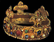 Essener Krone, angeblich von Otto III. bei der Krönung in Aachen getragen, wahrscheinlich erst in der ersten Hälfte des 11. Jahrhunderts entstanden.