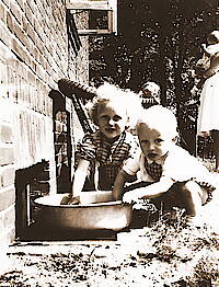 Meine Mutter schreibt: "Zeitweilig hatten wir ein junges Mädchen als Haushaltshilfe. Eines Sonntagsmorgens machte das Mädchen Kaffee und stellte die Kanne auf den großen Küchentisch, darauf saß Peter, knapp 3 Jahre alt und schaute aus dem Dachfenster. Beim Umdrehen fiel die Kanne um, und Peter verbrühte sich beide Beine fürchterlich. Nachbarin Frau Peter (Rotkreuzschwester) leistete Erste Hilfe. Unser Hausarzt Dr. Weselmann kam und besorgte über die amerikanische Besatzung Penicillin, damit die Wunden heilten und keine Sepsis eintrat. Ich saß Tag und Nacht an Peters Bett und hatte große Sorge. Der Großvater, nach dem Peter verlangte, kam aus Neumünster und löste mich ab."