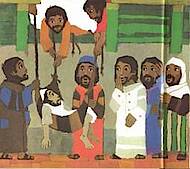 Und es kamen etliche zu ihm, die brachten einen Gichtbrüchigen von vieren getragen. Und da sie ihn nicht konnten zu ihm bringen vor dem Volk, deckten sie das Dach auf, da er war, und machten eine Öffnung und ließen das Bett hernieder, darin der Gichtbrüchige lag (Markus 2, 3-4).