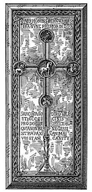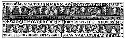 Um den Sargdeckel zieht sich in romanischen Majuskeln ein Zitat aus dem Hiobbuch (Hi 19,25): "Ich weiß, dass mein Erlöser lebt. Und am Jüngsten Tage werde ich von der Erde auferstehen. Und ich werde umgeben werden mit meiner Haut und meinem Fleische Gott, meinen Heiland, sehen. Ich selber werde ihn sehen und meine Augen werden ihn anschauen, nicht ein anderer. Diese meine Hoffnung ruht in meinem Busen."