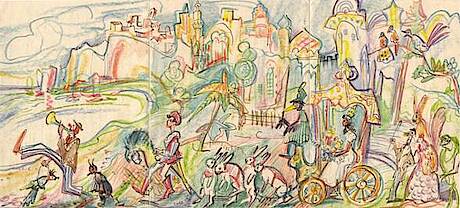 - Farbige Handzeichnung von Fritz Hanel zur Geburt der Freundestochter Karin Godzik in einem persönlichen Brief an den acht Jahre jüngeren Breslauer Schulkameraden Helmut Godzik, der nach dem Krieg mit seiner Familie in Flensburg-Mürwik lebte. Fritz Hanel und Helmut Godzik schrieben sich von 1946 bis 1951 regelmäßig.