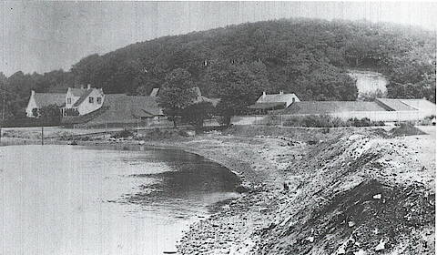 Eine Ziegelei bei Osbek, nahe der Mündung des gleichnamigen Baches, ist schon seit 1700 bekannt. Rechts sind die großen Trockenschuppen zu sehen. Als das Bild in den 1880er Jahren aufgenommen wurde, war das Werk noch in Betrieb. Es wurde jedoch 1900 stillgelegt, bevor der Staat das gesamte Gebiet kaufte, um den Marinestützpunkt und die Marineoffiziersschu le anzulegen.