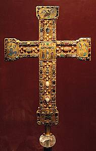 Das Essener Kreuz mit großen Emaillen und Edelsteinen und mit großen senkschmelzenden Emaillen (um 1000).
